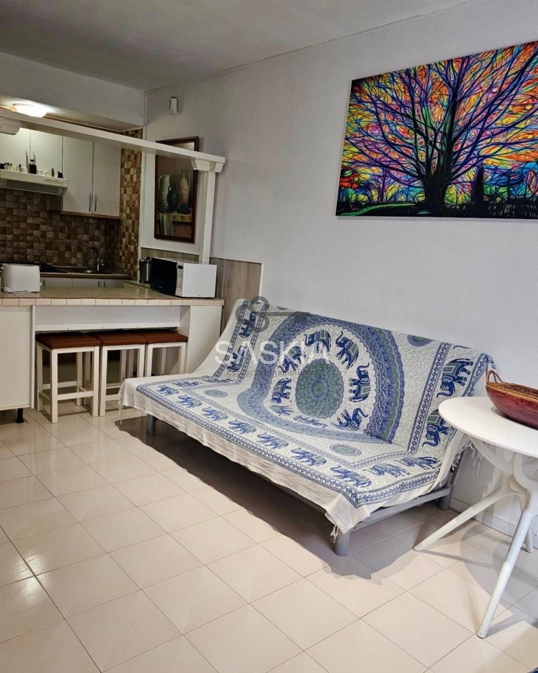 La propiedad cuenta con 43 m² distribuidos en 2 dormitorios, 1 baño y un salón con cocina abierta, decorado con un estilo práctico y acogedor.